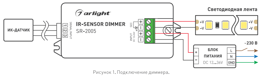 Инфракрасный бесконтактный диммер (расстояние срабатывания 1-6см). Диммирование при закрытии датчика рукой в теч-е 16 сек. В к-те ИК датчик и блок управления.