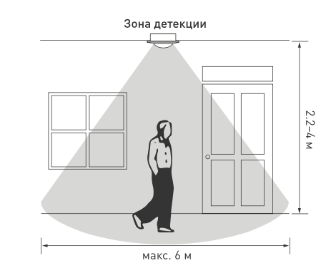 Инфракрасный датчик движения, совмещенный с датчиком освещенности. Высота установки - 2,2 - 4 м. Угол обнаружения 360°. Настройки: время отключения (10 c – 7 мин), зона срабатывания (до 6 м), освещенность (3 - 2000 люкс).