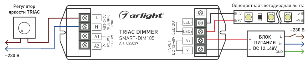 Диммер TRIAC для светодиодных лент. Сигнал управления TRIAC 40-220VAC. Винтовые клеммы. Управляется стандартными светорегуляторами TRIAC.