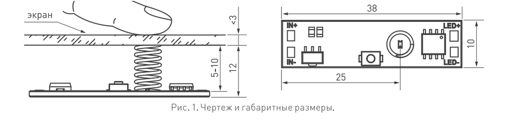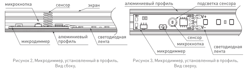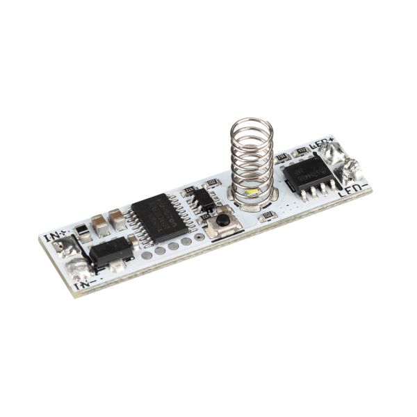 Сенсорный диммер с подсветкой (есть возможность регулировки яркости и отключение подсветки зоны сенсора), встраиваемый в профиль. Реагирует на прикосновение к экрану. Короткое нажатие - плавное включение и выключение света. Длинное нажатие - плавное изменение яркости свечения. Для профилей с внутренней высотой 10мм.