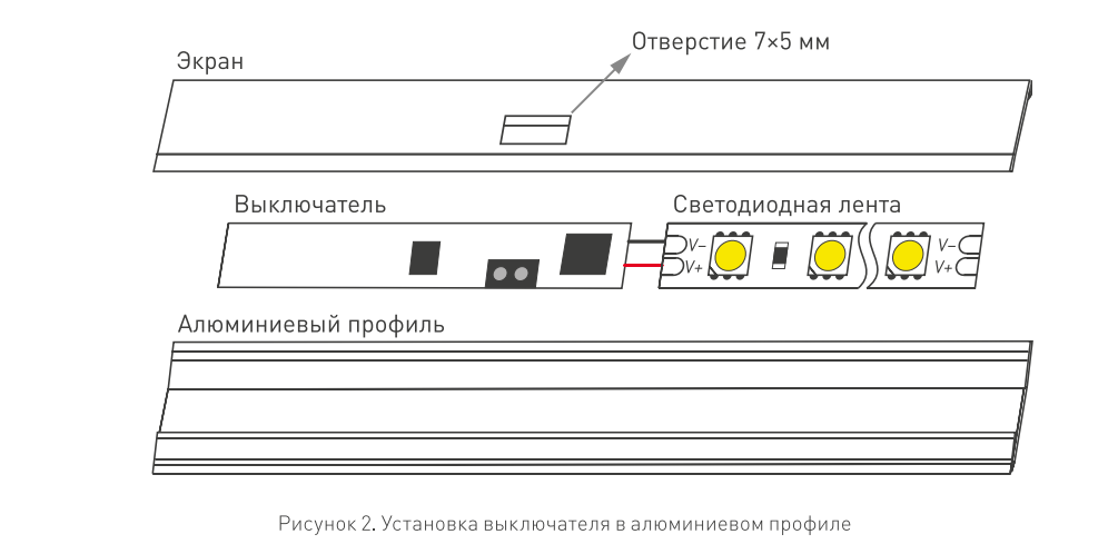 ИК-выключатель, встраиваемый в профиль, реагирует на движение руки. При улавливании движения - плавное включение и выключение света. Зона срабатывания до 80мм. Требуется вырез в экране профиля для работы датчика. Длина кабеля 60мм. Для профилей с внутренней высотой (пов. профиля - пов. экрана) до 10 мм.