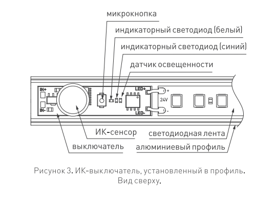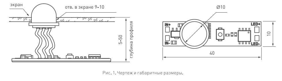 Пассивный ИК-выключатель, встраиваемый в профиль, реагирует на движение. При улавливании движения - плавное включение и выключение света. При пропадании движения - отключение света через ~2мин. Зона срабатывания 1,5-2м. Требуется вырез в экране профиля для работы датчика. Длина кабеля 60мм. Для профилей с внутренней высотой (пов. профиля - пов. экрана) от 10 до 20 мм.