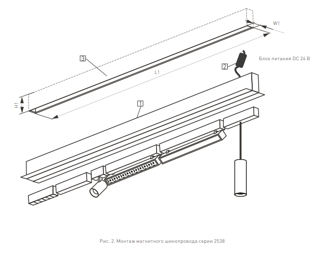 Мощность источника питания выбирается из расчета 100 Вт на 1 м длины сегмента шинопровода.