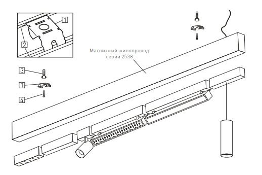 Подвесной, накладной магнитный трек, длина 2000 мм. Две заглушки в комплекте. Аксессуары для подвесного монтажа в комплект не входят.