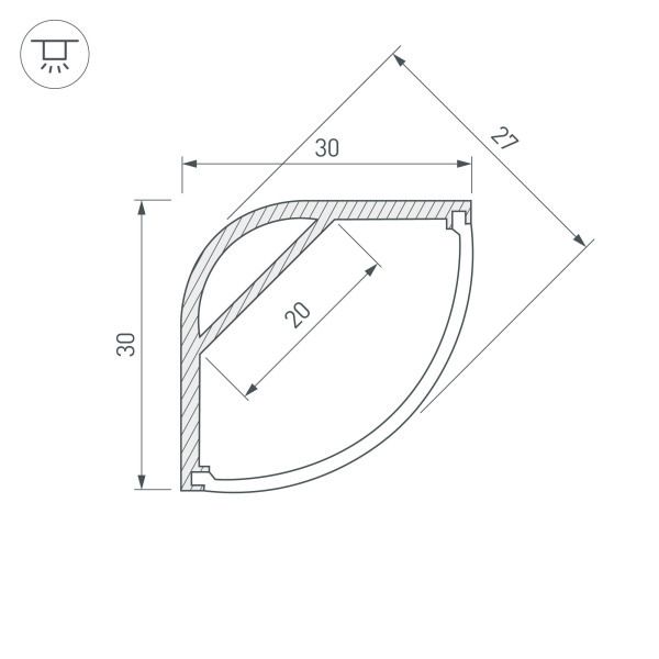 Алюминиевый анодированный угловой профиль для светодиодных лент и линеек. Ширина площадки для ленты 20 мм.