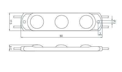 Герметичный светодиодный модуль IP67, напряжение 12 В, мощность 1.2 Вт, св. поток 120 лм, 3 светодиода SMD 2835, угол 170°. 20 шт на проводе, расстояние между центрами модулей 180 мм, длина провода между модулями 105 мм, рекомендуемая глубина установки 60–150 мм. Размер 80x17.5x6.2 мм. Гарантия 5 лет. Высокая световая эффективность.