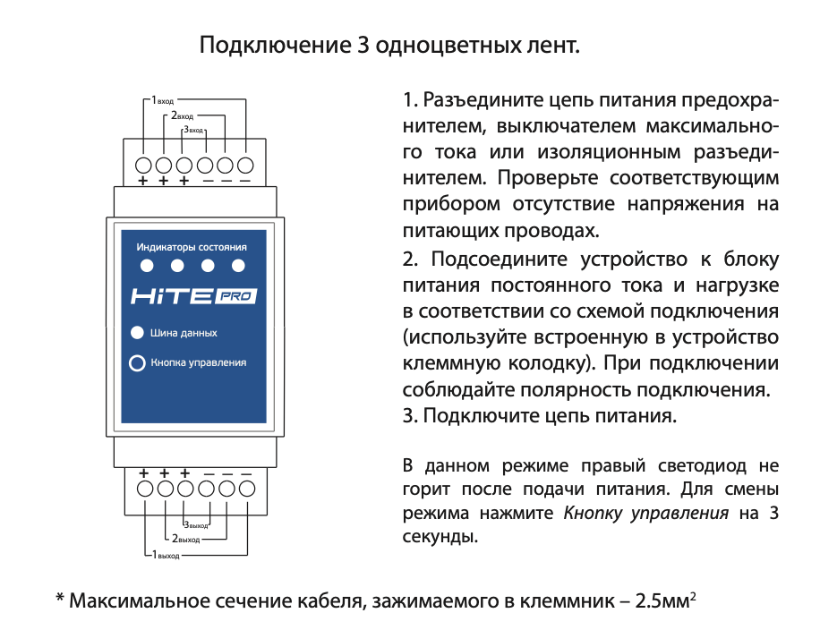 HiTE PRO Relay-LED3S – это трехканальное реле является частью модульной системы, используется для беспроводного управления 3-мя линиями электрической цепи (3 одноцветных светодиодных ленты или RGB-лента) и имеет шину данных для подключения к радиопередающему устройству (HiTE PRO Relay-M). С помощью этого блока можно не только включать/выключать, но и регулировать яркость светодиодной/RGB-ленты. Передатчиками являются другие устройства HiTE PRO: беспроводные выключатели, пульты ДУ, датчики, сервер умного дома.