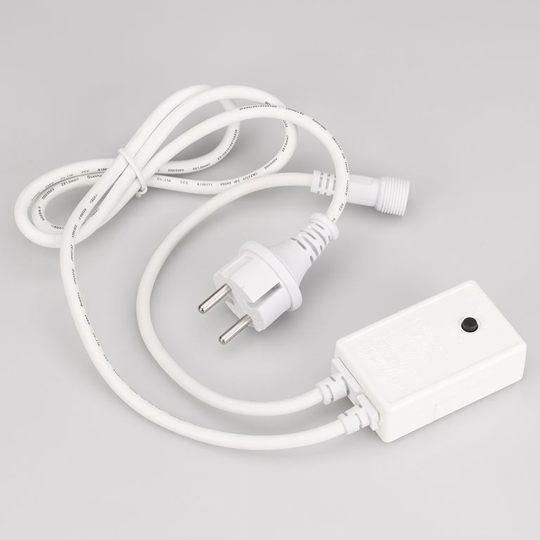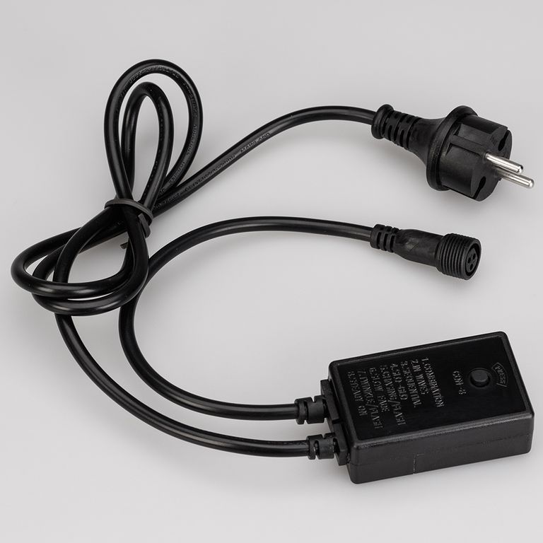 Контроллер для светодиодных гирлянд с эффектом динамики. Материал оболочки ПВХ. В комплект входит: провод питания с вилкой европейского стандарта (IP44), 3pin разъем подключения к гирлянде, выпрямитель AC/DC (1.6A), контроллер для смены режимов динамического свечения (8 режимов). Длина провода 1.5 метра.