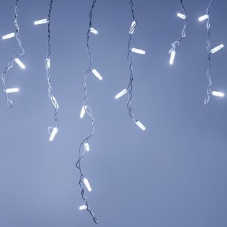 Размер 2400 мм (длина 2400 мм, по длине 24 нити высотой 200/600 мм). Количество светодиодов 88 шт размером 7 мм. Основной цвет свечения БЕЛЫЙ (6000 К), эффект мерцания редких точек (БЕЛЫЙ 6000К) с резким световым рисунком (прозрачная вогнутая линза), соотношение светодиодов: 22 белых постоянного свечения / 12 белых с мерцанием. Эффект частого мерцания.