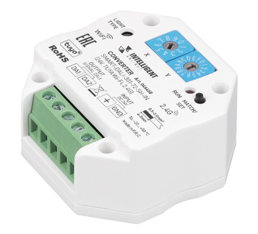 Конвертер предназначен для транслирования команд от RF и Wi-Fi (Tuya, SmartLife) сигнала в шину DALI. Интерфейс DALI DT8. Устройство позволяет управлять стандартными драйверами DALI для DIM/MIX/RGB/RGBW/RGBW-MIX источников света, таких как светодиодная лента, светильники и т.п. Поддерживает управление от радиочастотных пультов дистанционного управления и настенных панелей управления серии SMART. Режим работы устанавливается вращающимися переключателями на корпусе конвертера. Управление при помощи приложения Tuya, Smart Life, а так же Яндекс.Алисы. Питание устройства 24В. Габариты конвертера составляют 52х52х27 мм и позволяют установить устройство в стандартную монтажную коробку.