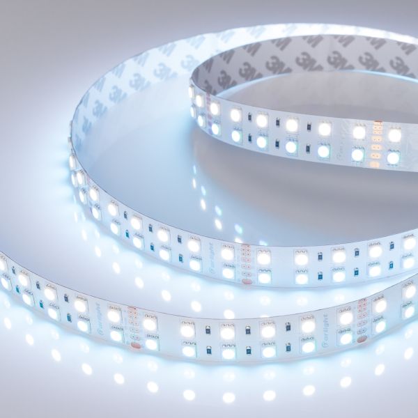 Светодиодная лента RT-B144 с открытой конструкцией и светодиодами 5060 содержит 144 светодиода на метр (всего 720 на 5 метров). Ширина платы составляет 19 мм. Лента поддерживает цвета RGB и белый цвет 6000 K, имеет индекс цветопередачи CRI более 85 и угол излучения 120 градусов. Работает от источника питания 24V, мощность 32 Вт/м (160 Вт на 5 метров). Размеры ленты: 5000x19x2,2 мм. Минимальный отрезок составляет 83,33 мм и содержит 12 светодиодов.