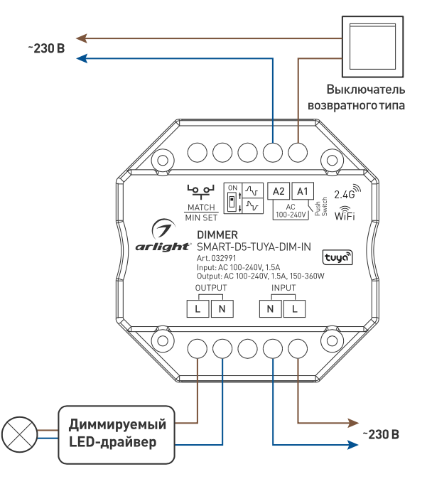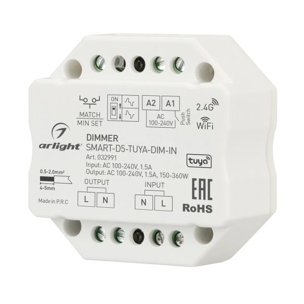 TRIAC диммер предназначен для управления регулируемыми лампами с напряжением питания 230 В. Он может управляться с помощью пультов и панелей серии SMART и поддерживает функцию Push-Dim. Оснащен интерфейсом Tuya и встроенным Wi-Fi. Поддерживает управление с помощью Яндекс Алиса и совместим с приложением SMART LIFE. Питание осуществляется от сети 100-240 В переменного тока, максимальный ток составляет 1.5 А. Мощность указана для одиночных нагрузок, более подробную информацию можно найти в технической документации. Габариты диммера: 52x52x26 мм.