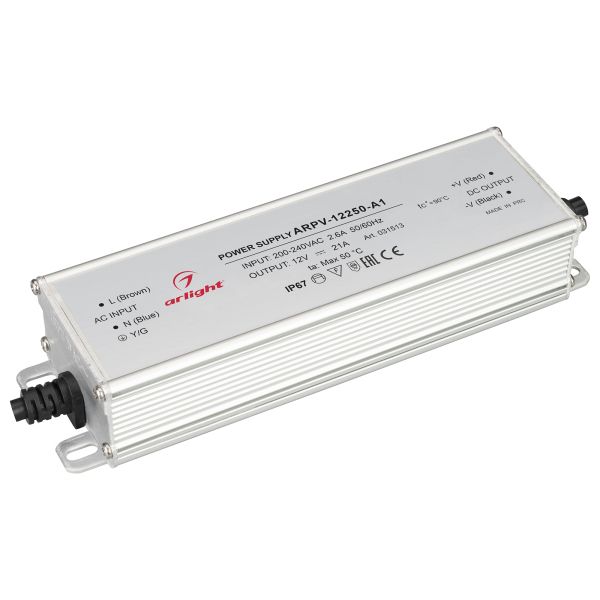Устройство предназначено для питания светодиодных приборов и оснащено гальванической развязкой. Оно может работать от сети с напряжением от 200 до 240 вольт переменного тока (VAC). На выходе устройство выдаёт 12 вольт, 21 ампер и 252 ватта. Благодаря встроенному корректору коэффициента мощности (PFC), эффективность работы устройства выше 0,5.