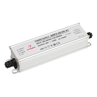 Источник напряжения с гальванической развязкой для светодиодных изделий. Работает от сети переменного тока напряжением 200-240 вольт. На выходе выдаёт 48 вольт, 2,08 ампера и мощность 100 ватт. Встроенный PFC с коэффициентом более 0,5.