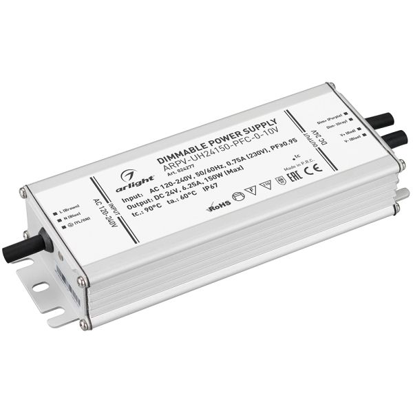 Диммируемый источник напряжения по стандарту 0/1-10 В с гальванической развязкой для светодиодных изделий. Работает от сети переменного тока напряжением 120-240 вольт. На выходе выдаёт 24 вольта, 6.3 ампера и мощность 150 ватт. Встроенный PFC с коэффициентом более 0.95.