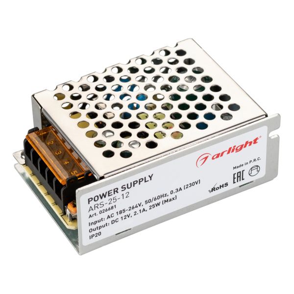 Устройство предназначено для питания светодиодных приборов и обеспечивает их работу благодаря встроенной гальванической развязке. Оно может быть подключено к электросети с напряжением от 185 до 264 вольт переменного тока (VAC). На выходе устройство выдаёт 12 вольт, 2,1 ампера и 25 ватт. Благодаря встроенному корректору коэффициента мощности (PFC), эффективность работы устройства превышает 0,5.