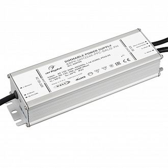 Диммируемый источник напряжения с использованием протокола DALI 2.0 и гальванической развязкой для светодиодных устройств. Диапазон входного напряжения составляет 120–240 В переменного тока. Основные выходные характеристики: 12 В, 20 А и 240 Вт. Встроенный PFC с коэффициентом больше 0,95. Герметичный алюминиевый корпус имеет степень защиты IP67. Рабочий диапазон температур составляет от −40 до +70 °C. Размеры источника: длина — 188 мм, ширина — 67,5 мм, высота — 38,5 мм. Гарантия предоставляется на 7 лет. При превышении выходной мощности происходит снижение напряжения, и устройство переключается в режим источника тока (режим CV+CC).