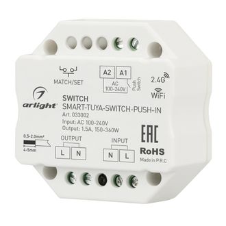 Этот выключатель подходит для любых типов электрических нагрузок переменного тока с напряжением 230 В. Питание осуществляется от сети переменного тока с напряжением 100-240 В, а максимальный ток нагрузки составляет 1.5 А. Управление осуществляется через два канала: 2.4G и WiFi, с использованием интерфейса Tuya. Поддерживается управление с помощью Яндекс Алиса и приложения INTELLIGENT ARLIGHT. Также доступна функция Push-Switch. Габариты выключателя составляют 52x52x26 мм, и он совместим с различными пультами и панелями SMART.