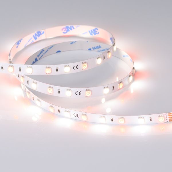 Цвет ленты может быть как RGB, так и дневным с цветовой температурой 4000 K. CRI превышает 85, угол излучения 120°. Лента работает от источника питания 24V, мощность 14,4 Вт/м (или 72 Вт на 5 метров).