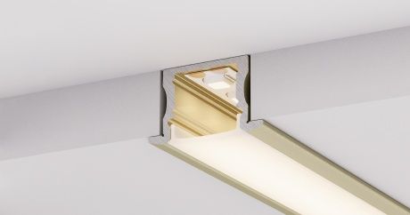 Представляем стильный алюминиевый профиль с золотистым анодированным покрытием, оснащенный накладным фланцем для элегантной контурной подсветки различных элементов интерьера.