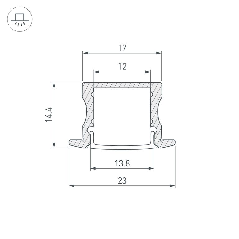Технические характеристики изделия: длина профиля 2000 мм, ширина 23 мм, а высота – 14,4 мм. Специальная платформа разработана для удобной установки светодиодных лент шириной до 12 мм и мощностью не более 19,6 Вт на метр длины, что открывает широкие возможности для реализации разнообразных световых сценариев.