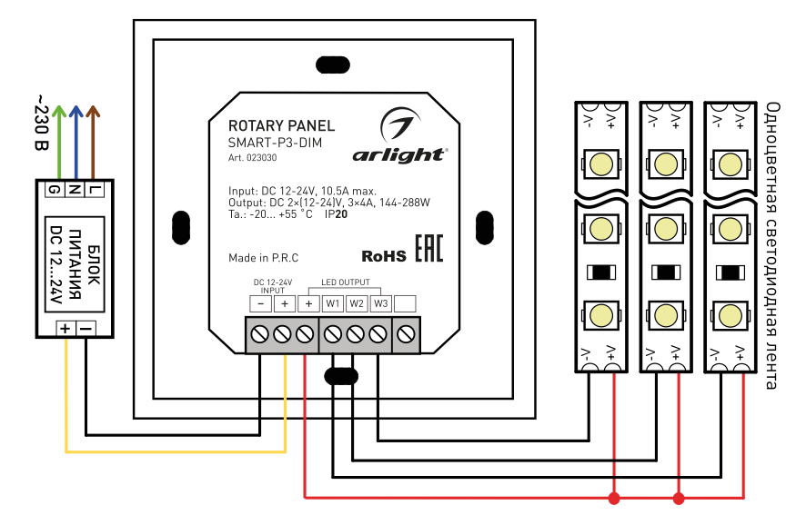 Панель Arlight Rotary SMART-P3-DIM используется как трехканальный диммер с выходами для подключения одноцветных светодиодных лент.