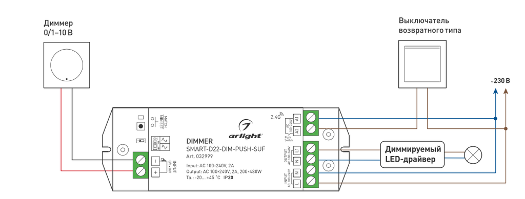 TRIAC диммер, для управления яркостью глассических ламп накаливания и галогенных ламп. Поддерживает функцию Push-Dim. Совместим с пультами и панелями SMART, поддерживает управление по 0/1-10V.