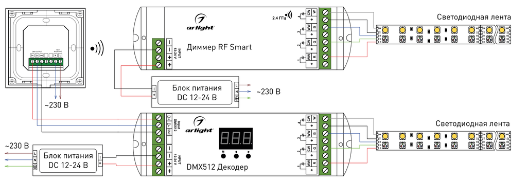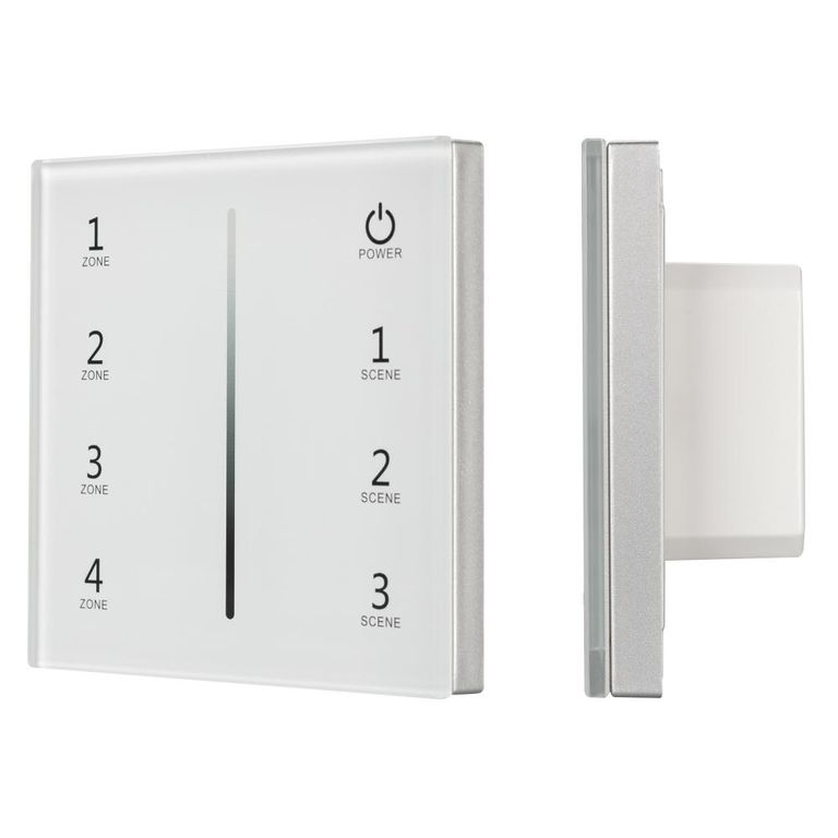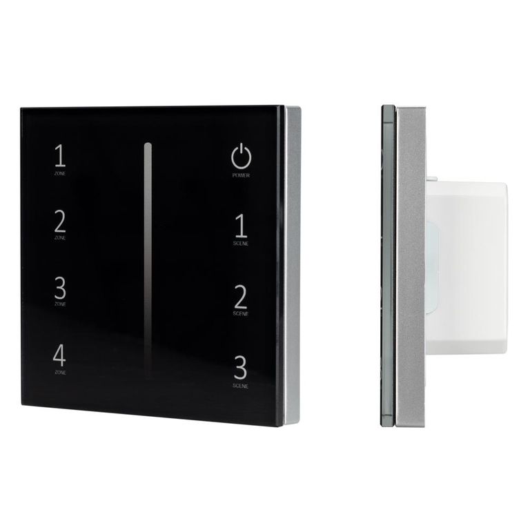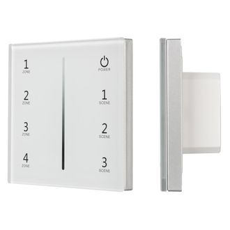 Панель Arlight Sens SMART-P17-DIM используется как 4-зонный пульт дистанционного управления для управления радиоканальными устройствами SMART, также может использоваться в качестве 4-зонного мастера DMX512.