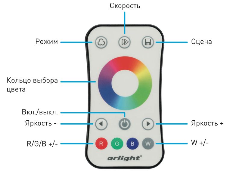 Кнопочный радиопульт с сенсорным кольцом 2.4 ГГц белого цвета для управления RGB/RGBW источником света. 1 зона управления, выбор цвета с помощью сенсорного кольца. Питание 3VDC (CR2032). Габариты 107x58.5x9 мм. Изготовлен из пластика с покрытием, защищающим от загрязнения. Управляет контроллерами и панелями серии SMART (поставляются отдельно).