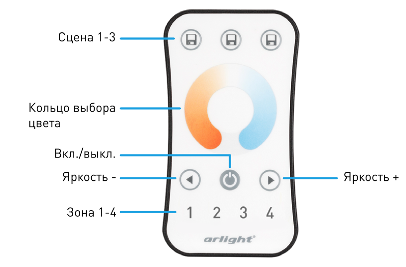Кнопочный радиопульт с сенсорным кольцом 2.4 ГГц белого цвета для управления MIX (CCT) источником света. 4 зоны управления, выбор температуры свечения с помощью сенсорного кольца. Питание 3VDC (CR2032). Габариты 107x58.5x9 мм. Изготовлен из пластика с покрытием, защищающим от загрязнения. Управляет контроллерами и панелями серии SMART (поставляются отдельно).