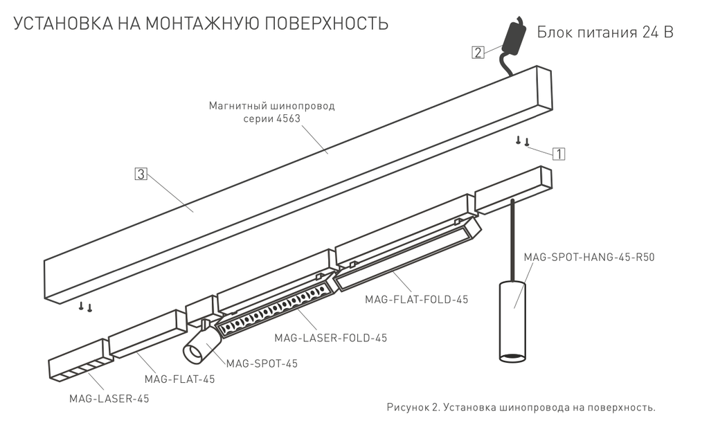 Подвесной, накладной, встраиваемый магнитный трек (шинопровод) серии MAG, длина 1000мм. Две заглушки в комплекте.